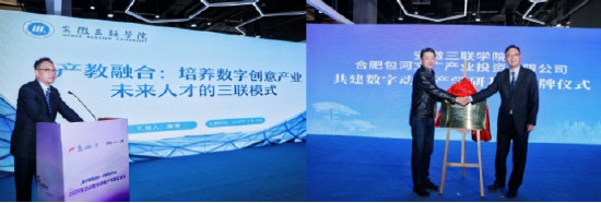 当日下午,由安徽三联学院参与主办的2025紫云山数字创意产学研交流会(论坛)在紫云山文化创意产业园顺利举行。潘涛发表了题为《产教融合:培养数字创意产业未来人才的三联模式》的主题报告,系统地阐述了学校在校企协同、项目驱动、工作室制等方面的创新探索及取得的显著成效。会议期间,安徽三联学院与合肥包河文广产业投资有限公司共同为校企共建的“数字动漫产学研基地”揭牌。